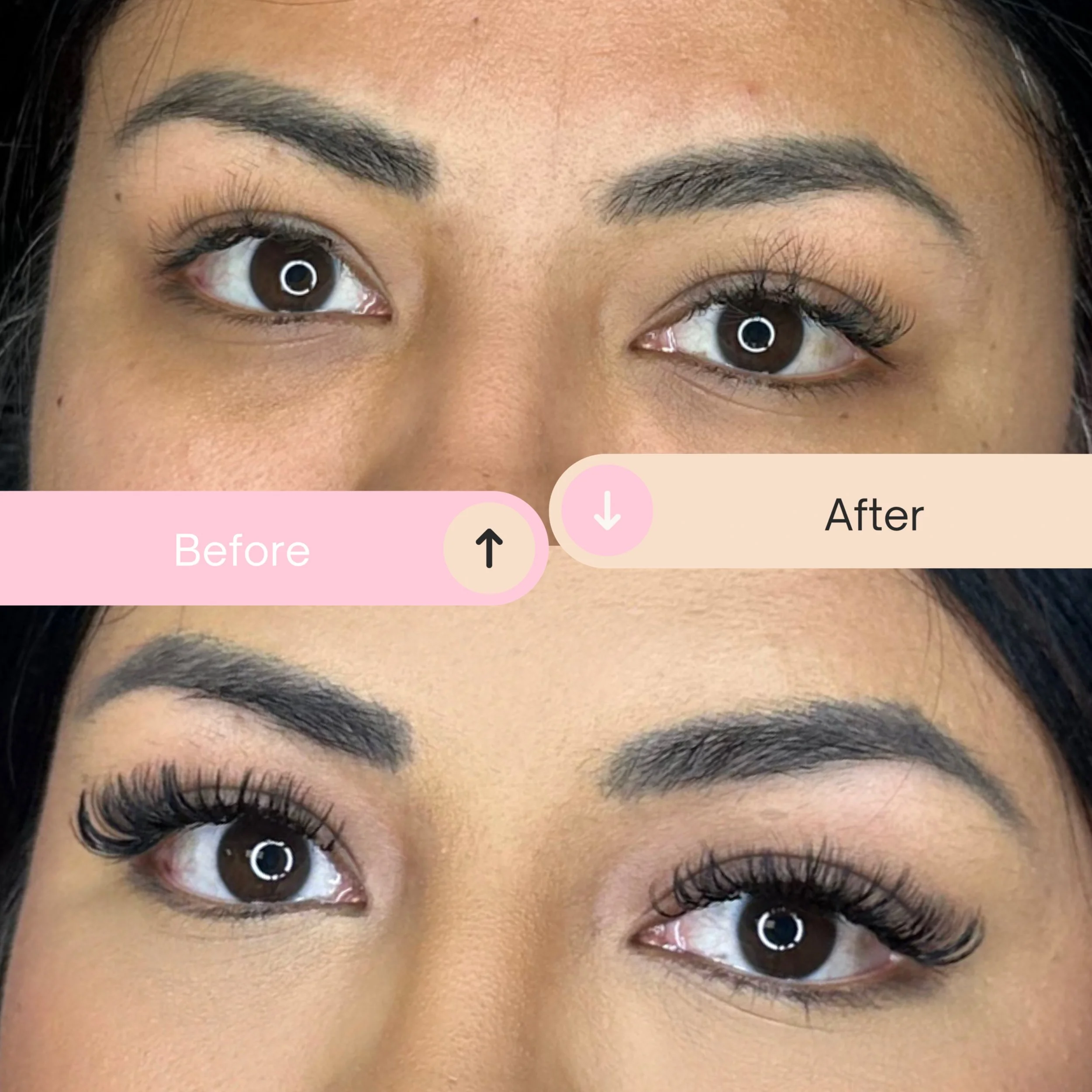 Before and after photos showing the application of eyelash extensions. The top image shows natural lashes, while the bottom image displays fuller, longer lashes.