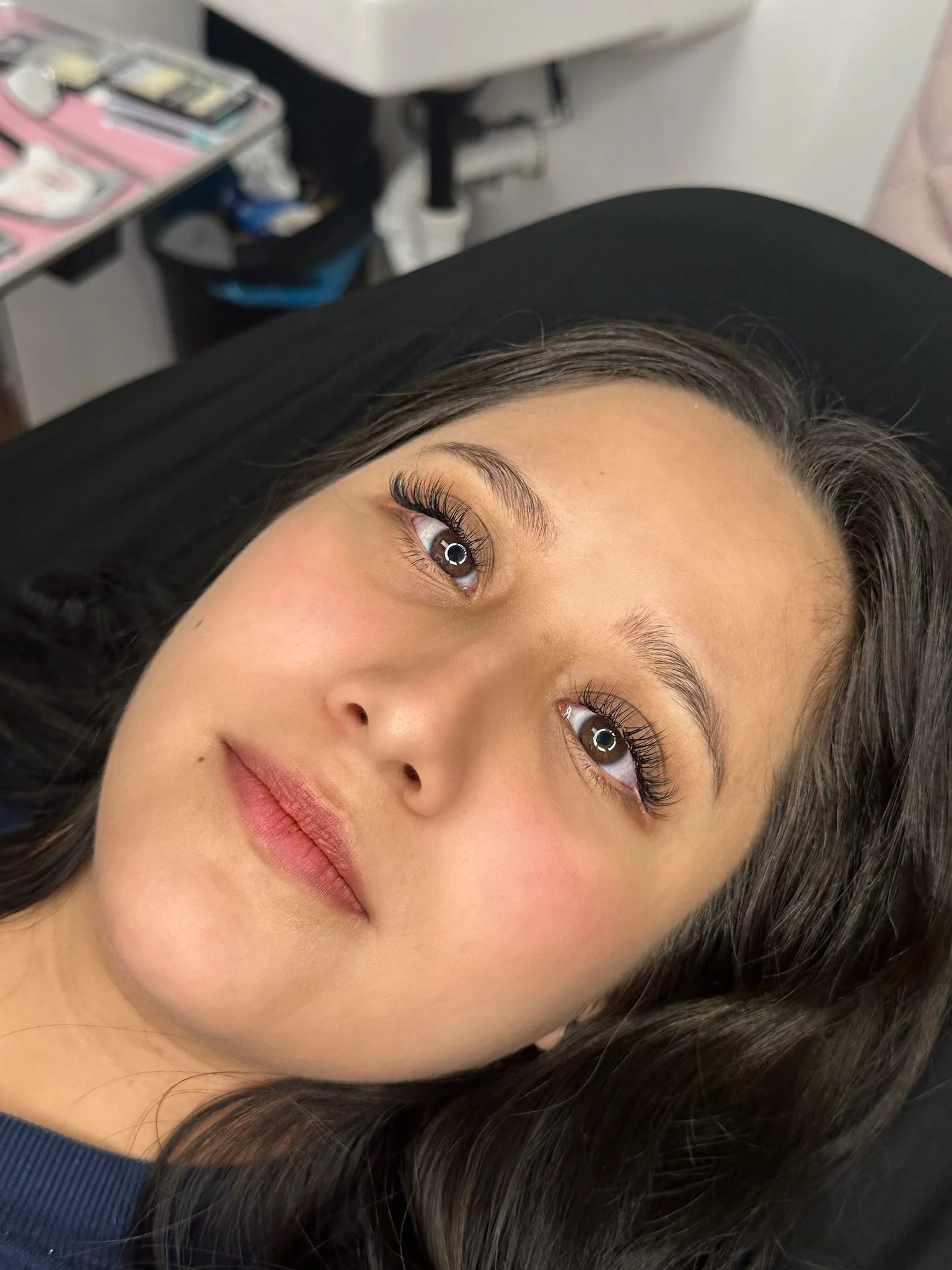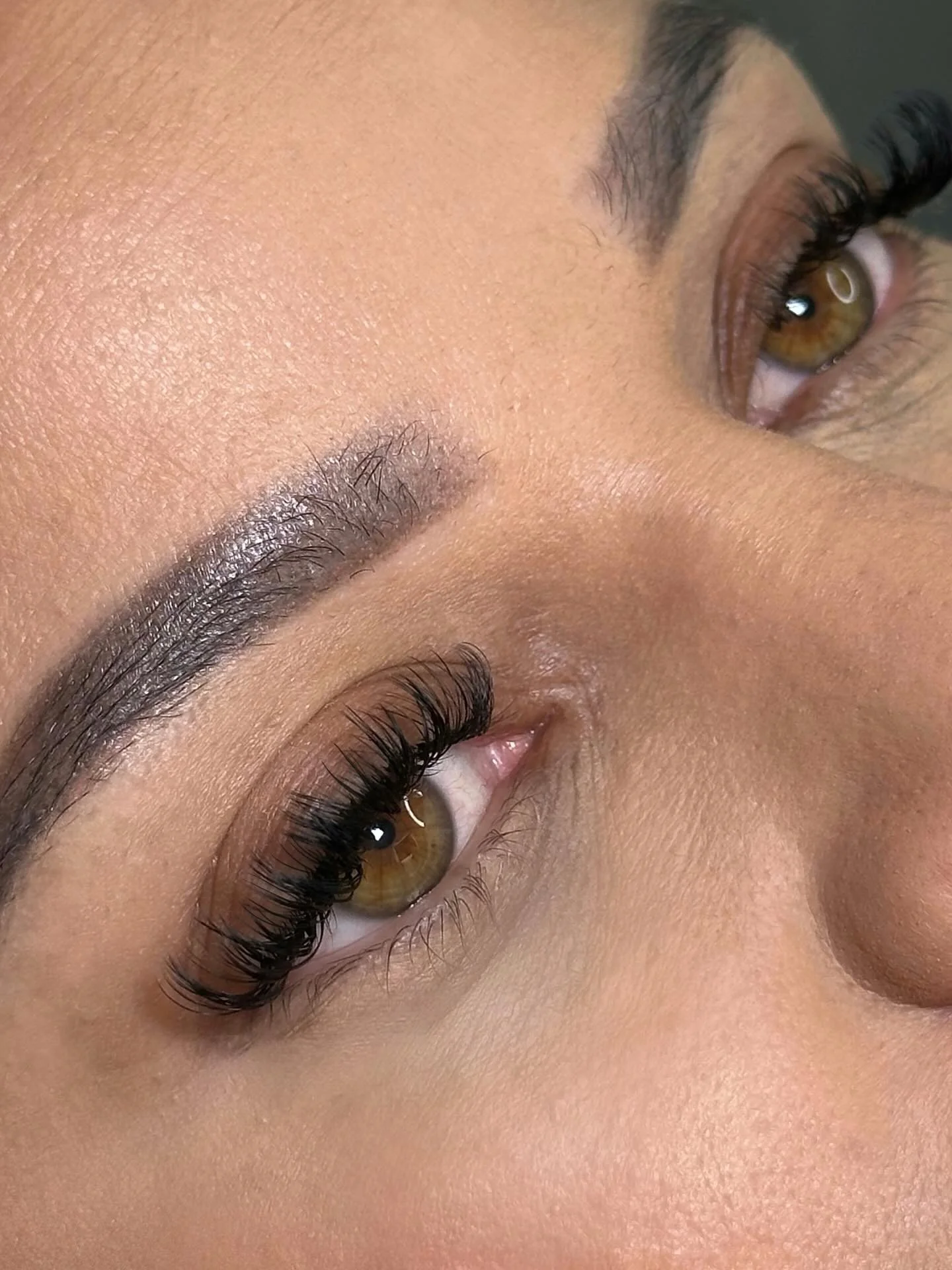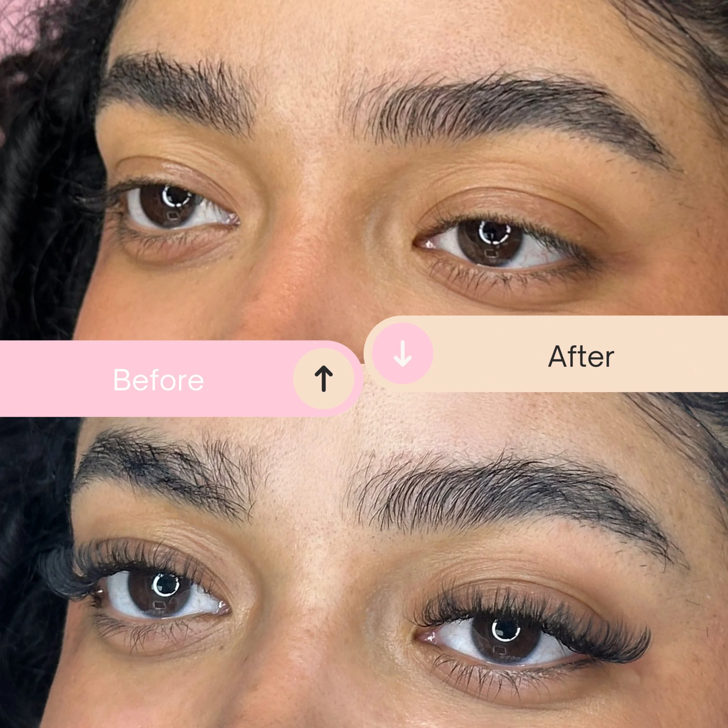 Before and after close-up of a person's eyes, showing changes with eyelash extensions and eyebrow enhancement.