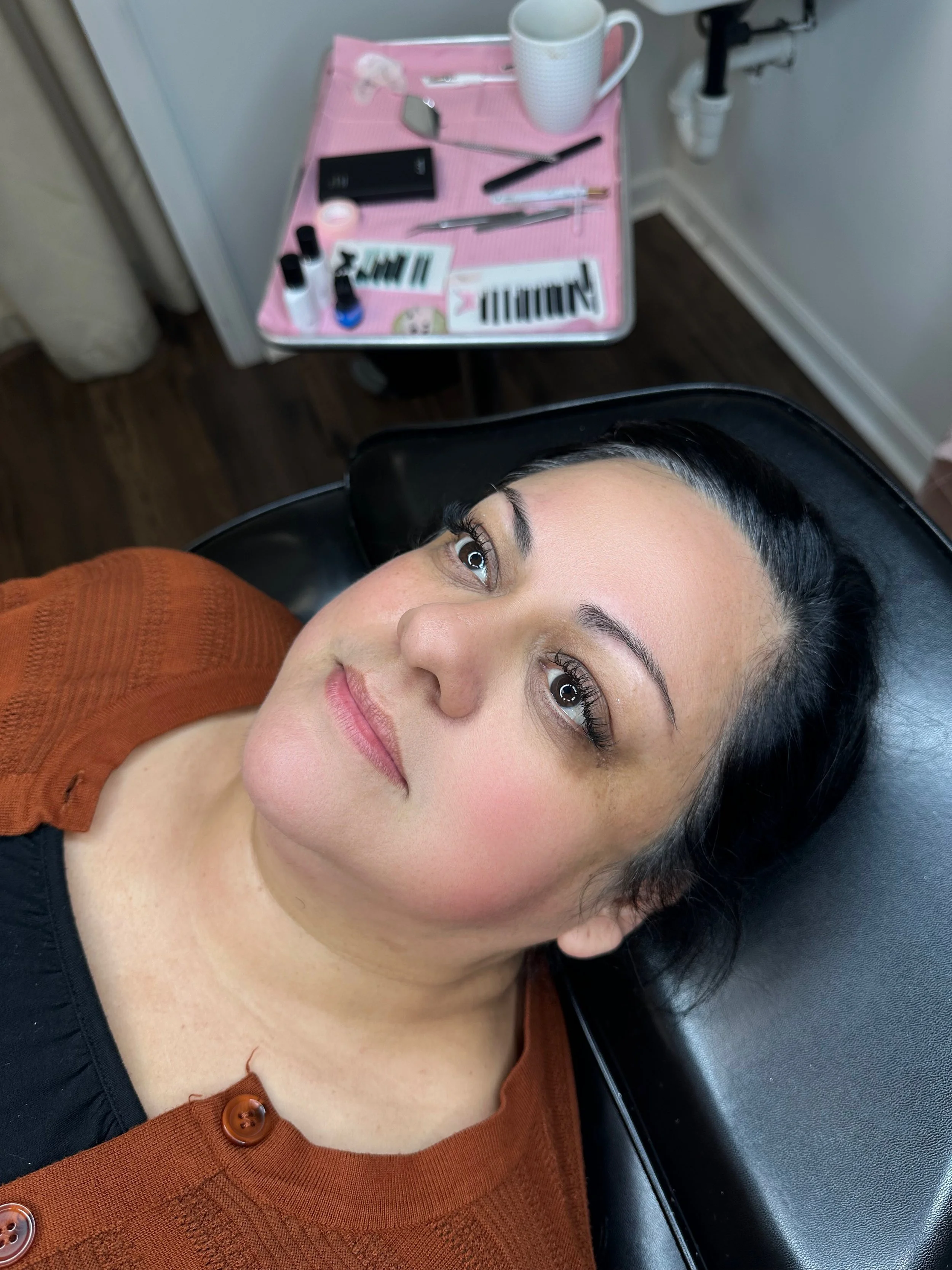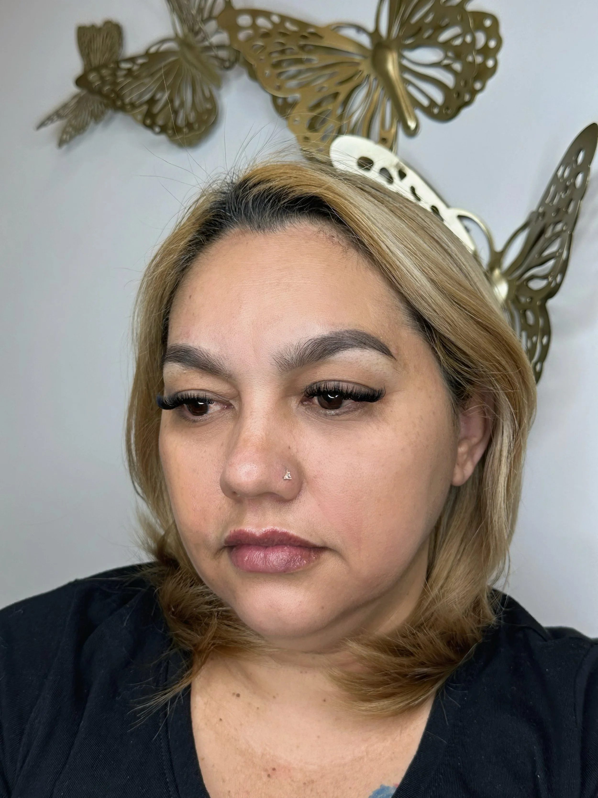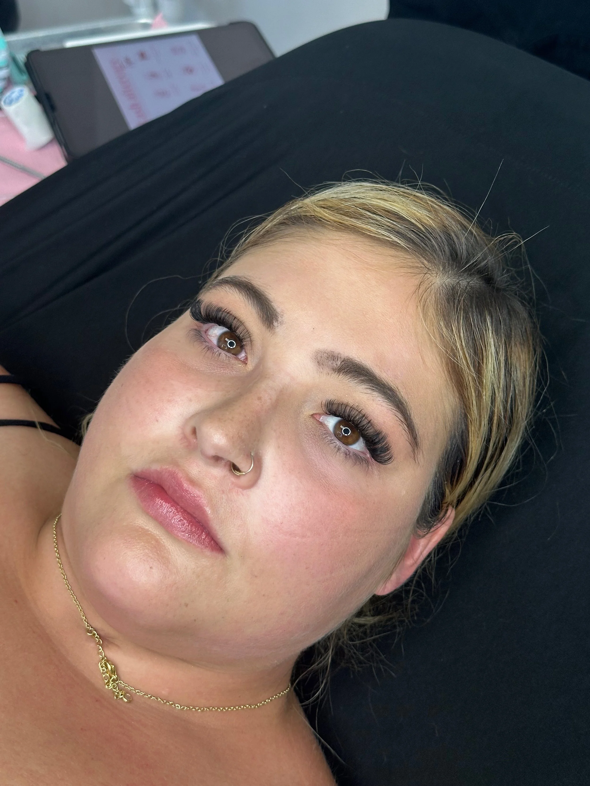 Before and after close-up of a person's eyes, showing changes with eyelash extensions and eyebrow enhancement.